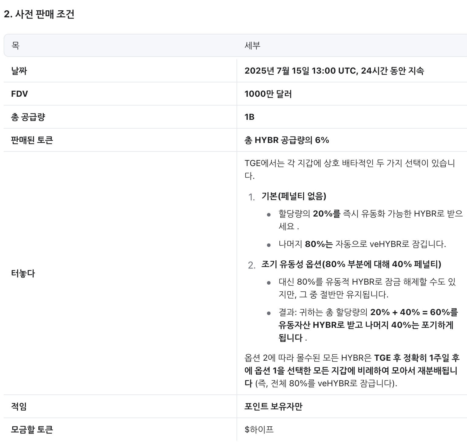 가장 중요한 토크노믹스입니다. 제네시스 드롭이 아마 에어드롭일 텐데 LP 제공자, 포인트 기반으로 하지 않을까 싶습니다. 물량이 너무 크니 아마 이 토큰을 거래소 fee로 주던 아니면 다른 마게팅에 스지 않을까 싶고, 사전판매가 15%인데 6%를 이미 팔았으니 나머지 9%가 남았습니다. 유동성이 8% 정도이니 아마 전부 veHYBR로 선형분배를 하지 않을까 싶습니다.