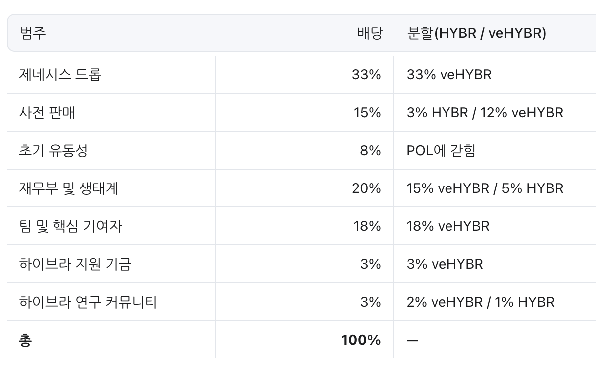 HYBR의 초기 공급량은 10억 개입니다. 제네시스 아까 에어드롭인줄 알았는데 역시 포인트 기반의 에어드랍, 그리고 커뮤니티 에어드랍 이거는 NFT일 화귤이 높고, 생태계 성장 기금은 거래소 상장에 다른 마케팅이고 프로토콜 재무부 이게 조금 그렇네요. 일단 에어드랍 비율이 중요할 것 같습니다.