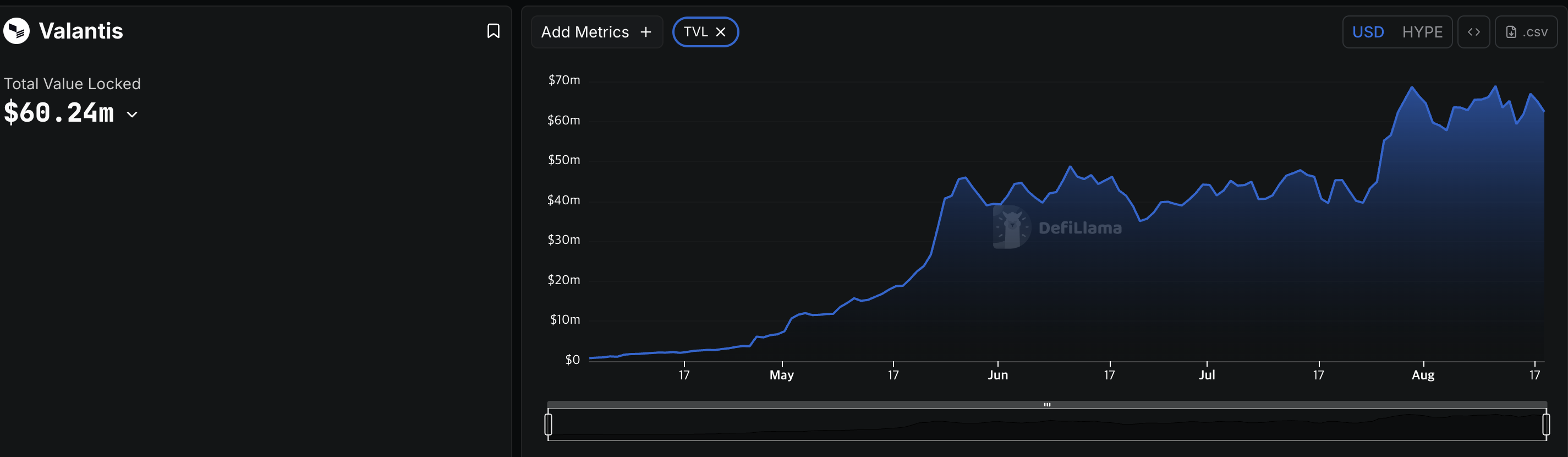 특정 자산군에 대한 수요가 있을 때 오르는 모습을 보이며, 스테이블 자산이 없고 Hype으로만 배치가 되어 있기에 hype의 가격에 따라 TVL 변하는 게 더욱 커 보입니다.