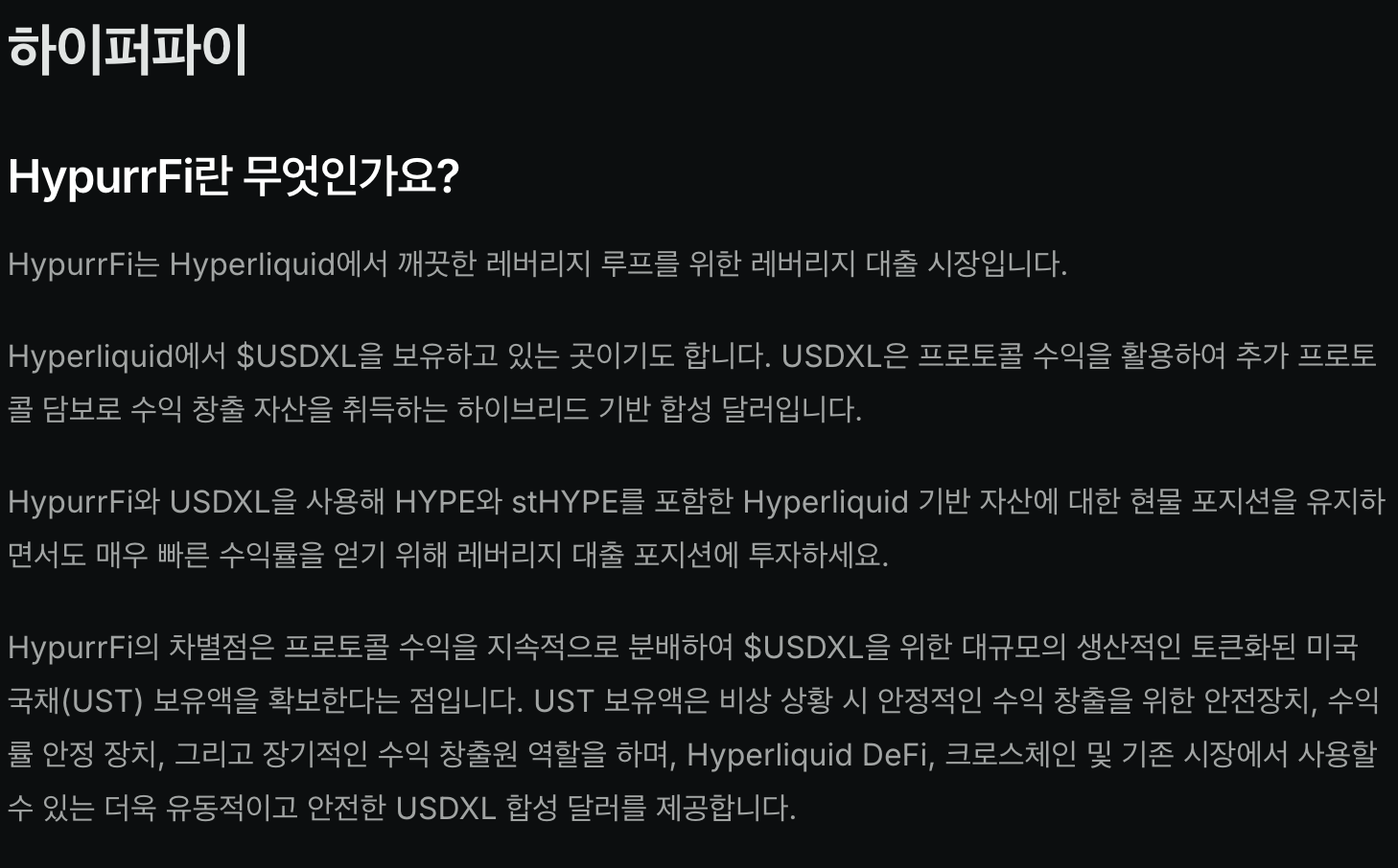 하이퍼파이는 하이퍼리퀴드의 Defi protocol 입니다. 자체적으로 USDXL을 보유하고 있고 다양한 Dapp에서 사용 중입니다. 흔한 Defi Protocol입니다. 그래도 유동성이 생각보다 커서 유용하게 사용하고 있습니다.
