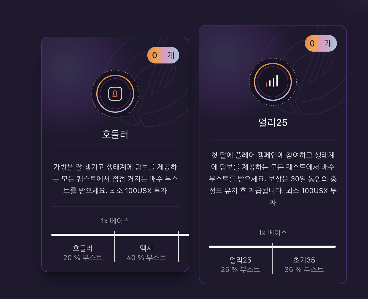 100 USX 이상 투자, 30일 유지하면 다양한 부스트를 얻을 수가 있습니다.