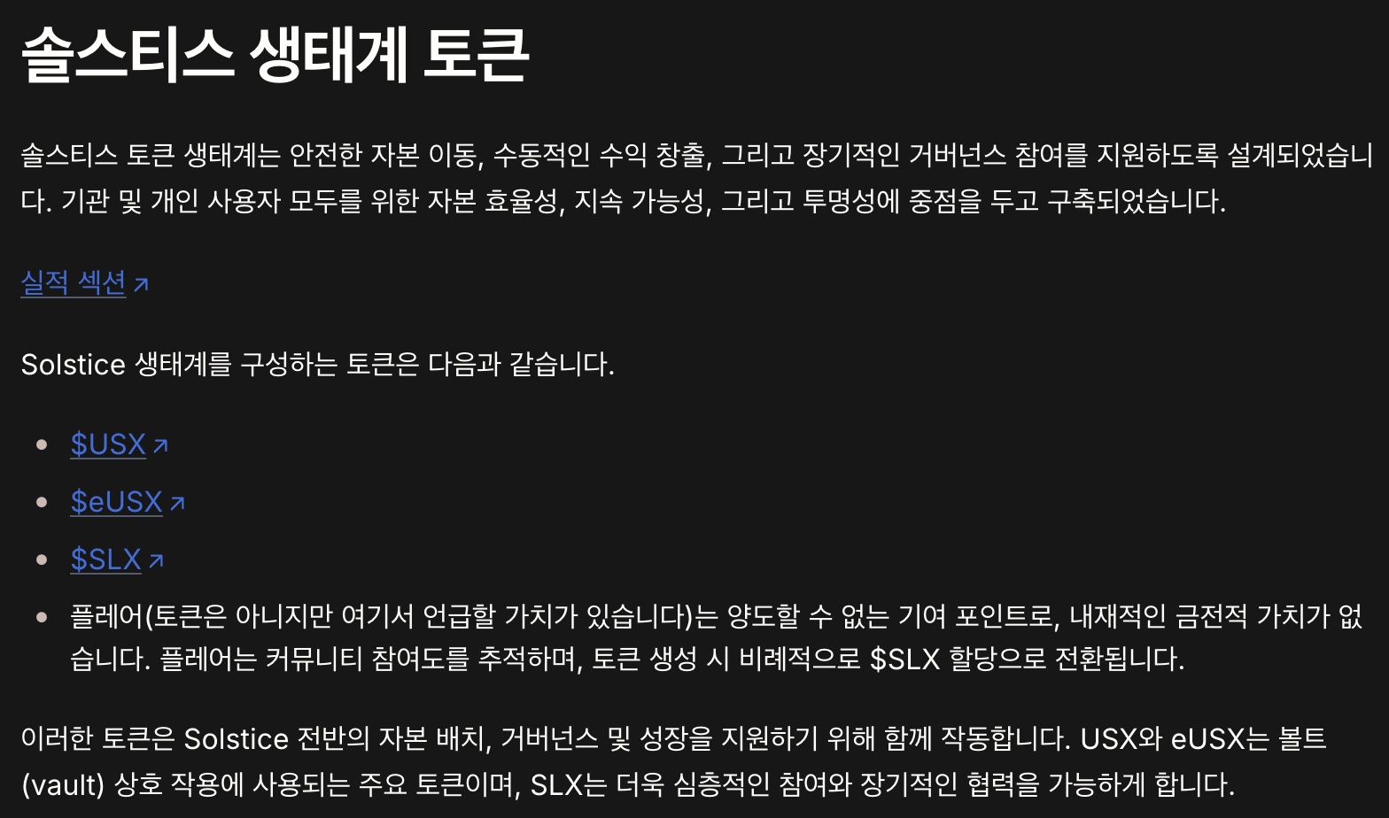 언제나처럼 디파이 프로토콜은 2가지 상품을 제시합니다. 여기는 USX라는 스테이블 코인을 통해 운영이 되며 스테이킹할 경우 eUSX로 APY를 받게 됩니다. 에어드롭 거버넌스 코인으로 SLX를 출시할 걸로 보입니다.