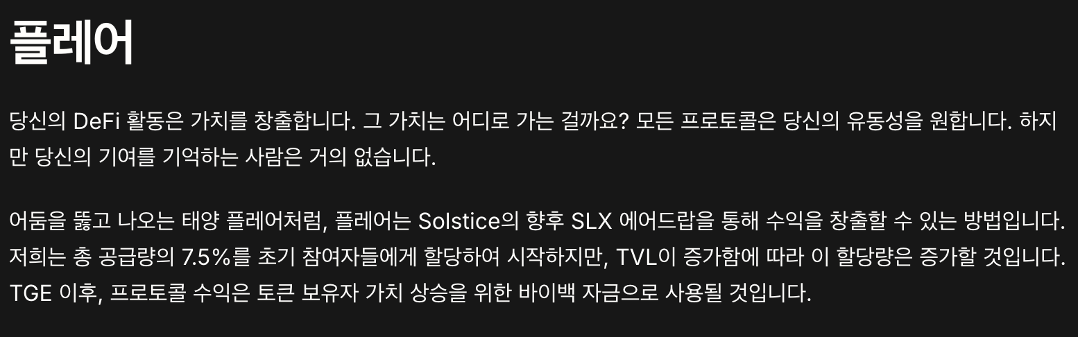 솔스티스는 플레어라고 하는 포인트를 얻어 참여도를 추적하고 이에 비례해서 SLX를 할당해 준다고 합니다.