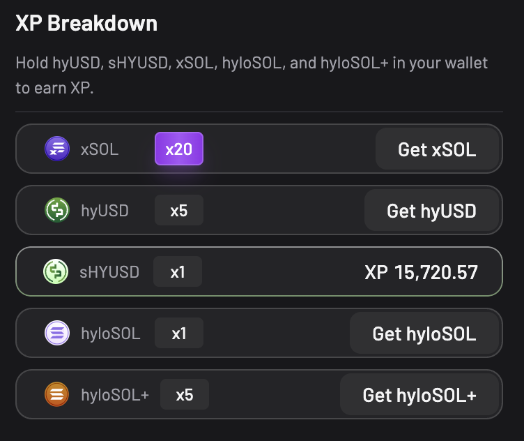 스테이블 자산은 hyUSD입니다. 이 스테이블이 기준이 되고 스테이킹을 할 겨우 sHYUSD를 얻게 됩니다. 그리고 hysol를 가지고 있지만 xSOL을 밀고 있는 모습을 보여줍니다.