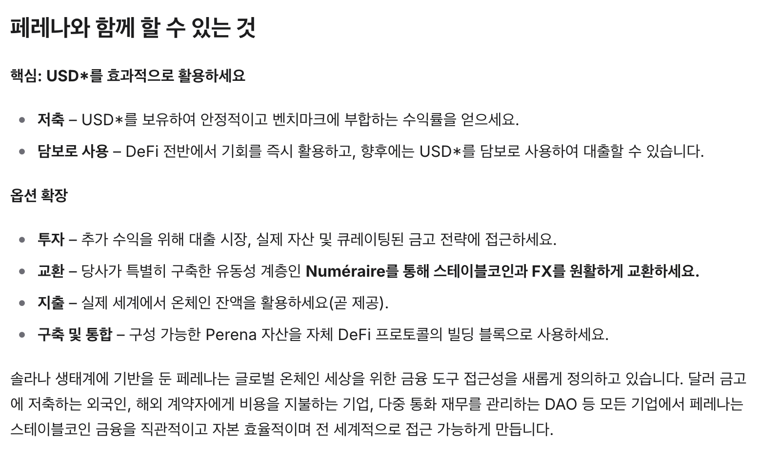 페레 나는 솔라나 계열 디파이 프로토콜로 USD*이라는 상품을 제시하여 다양한 인프라 구축을 하려고 합니다.