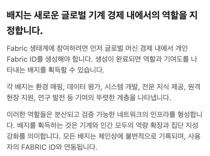 Fabric 생태계에 참여를 하려면 ID를 생성하여야 한다고 합니다. 뱃지를 체인상 기록으로 남겨지고 ID에 연동이 된다고 합니다.