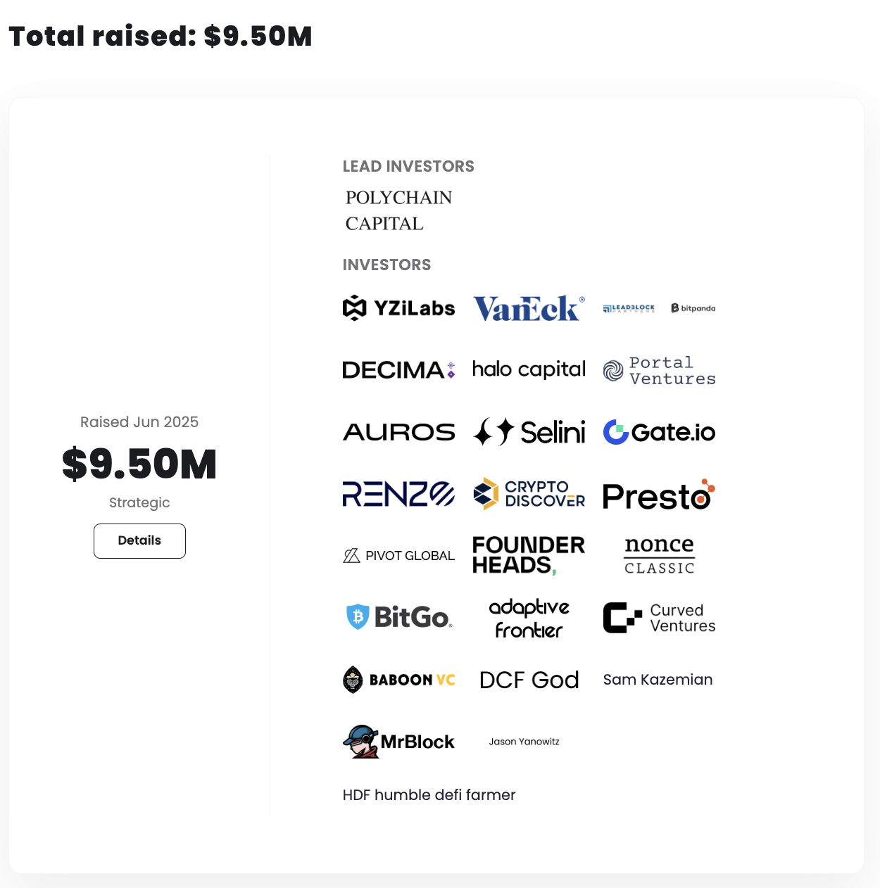 Raised된 금액은 모르지만 바이낸스, maelstrom 등 괜찮은 느낌을 가지고 있습니다. 또한 rateX나 exponent에서 2중 파밍이 되기에 여러 에어드랍을 동시에 노릴수 있습니다. 단점으로는 프리시즌, 시즌 0, 시즌 1등 시즌을 계속해서 이어나가 피로감을 유발하고 있고 생각 보다 사람이 많기에 먹거리가 적을수 있다는게 있습니다. DYOR 하시기 바랍니다.