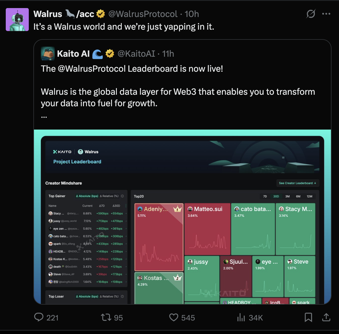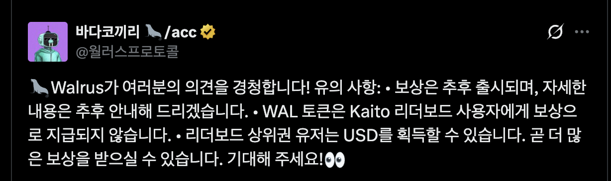 요새 이야기가 다시 나오고 있는 왈러스 다시 한번 들여다보려고 합니다. 저는 원래도 왈러스 스테이킹 작업을 하고 있었는데, 지금 카이토에서 왈러스 리더보드가 갑자기 올라오게 되어 핫해진 것 같습니다.