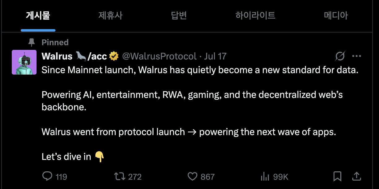불안한 점은 이제 너무 확장을 하려 하지 않나 하는 점입니다. 메인넷 출시 이후 왈러스가 다양한 곳으로 확장을 하며 파트너십을 하고 있는데 결국 스토리지 프로토콜의 근본을 잃어버리지 않았으면 좋겠습니다. 수많은 프로젝트가 잘 나간 후 너무 큰 확장을 통해 분산이 되어버려 근본을 잃어버리는 경우를 보았기에 ai, 엔터, RWA, 게임 다양한 백본망을 구성하려고 하는 건 좋지만 너무 급하게 가지 않았으면 좋겠네요.